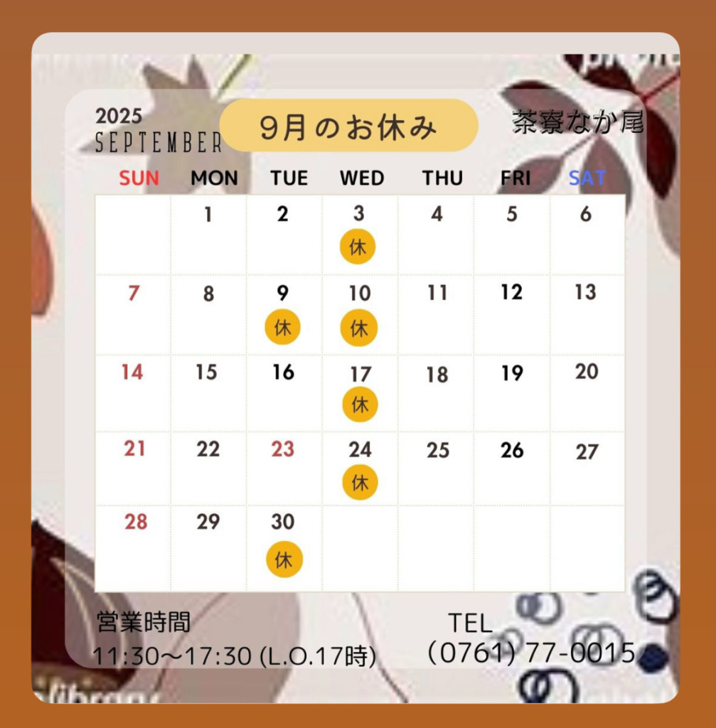 また、9月は第4火曜日が秋分の日(祝日)にあたる為、祝日は営業し、