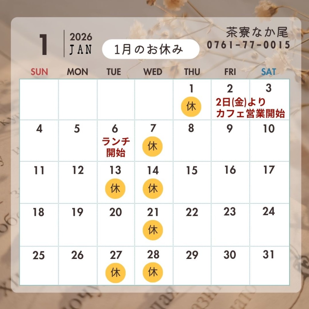 年始は1月2日(金)より、カフェ営業(軽食もご用意しております)
